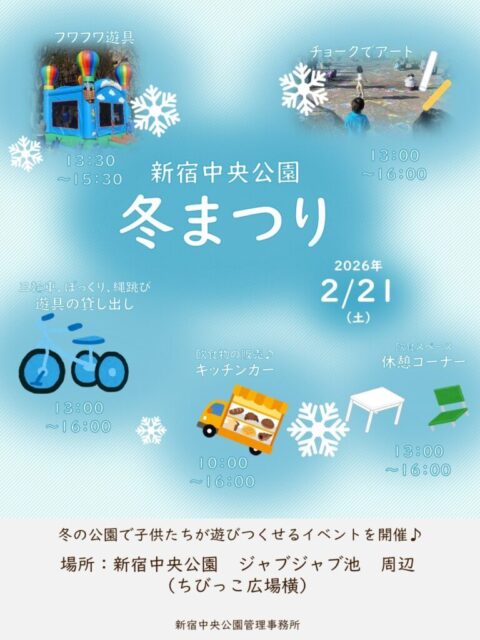 冬の新宿中央公園で、子どもたちが思いきり体を動かして遊べるイベントが開催されます。ジャンプして楽しめるふわふわドームや、三輪車・ぽっくりなどの遊具貸し出し、チョークで自由に描けるアート体験など、屋外ならではの遊びが充実。キッチンカーの出店や休憩コーナーも設けられ、家族でゆったり過ごせる冬の一日を楽しめます。